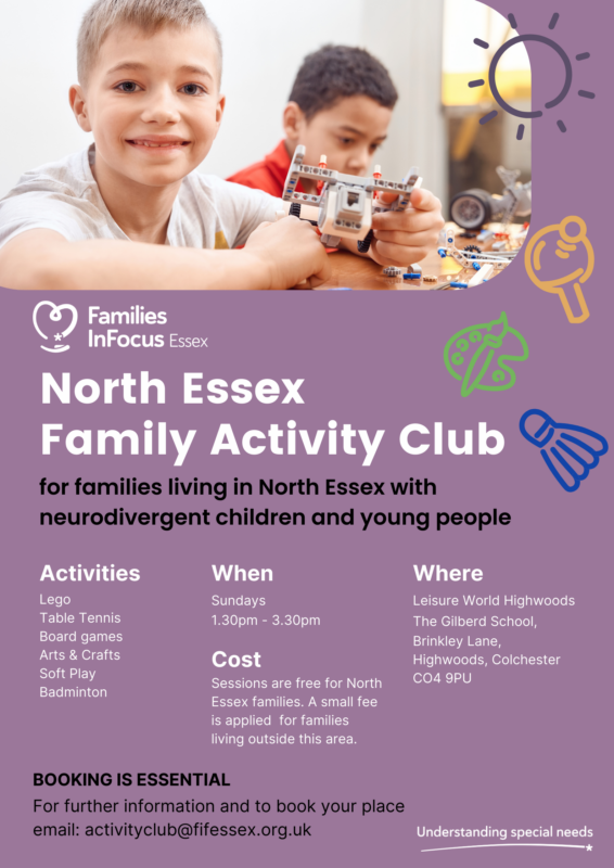 Join us and other families at the North Essex Activity Club, a weekly club that runs on Sundays, 1.30pm – 3.30pm, at the Lesiureworld, Highwoods Colchester. The club is open to children and young people from 0 – 25 years who have a neurodevelopmental condition (including, but not limited to, Autism and ADHD).